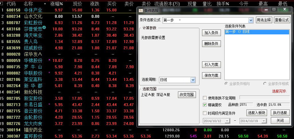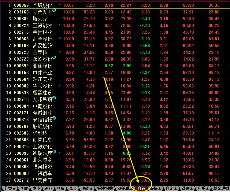 然后将选出的股票按涨幅排序,剔除:下跌的、停牌的、st *st等个股,最后存入自选股。
