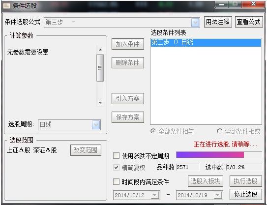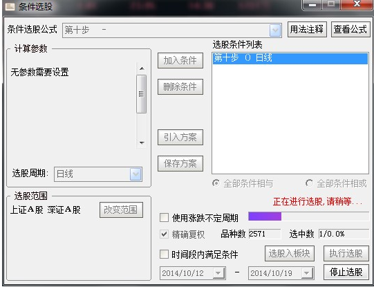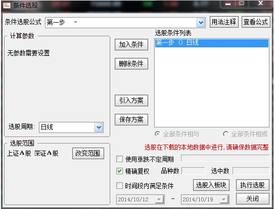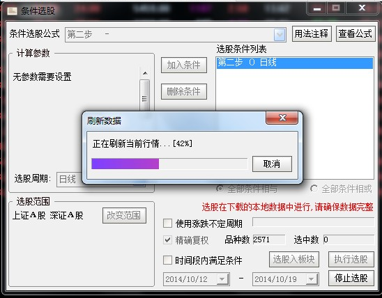 点击执行选股(第一次选股会提示下载行情数据,耐心等待下载完成就可以了)